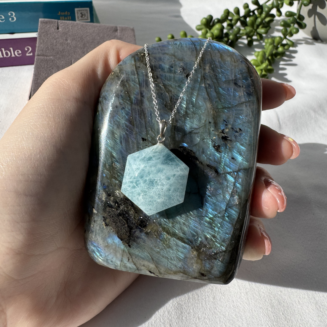 Sterling silver aquamarine hexagon pendant. Comes on an 18 inch chain, please let me know if you want a longer chain and I can get one ordered in for you.