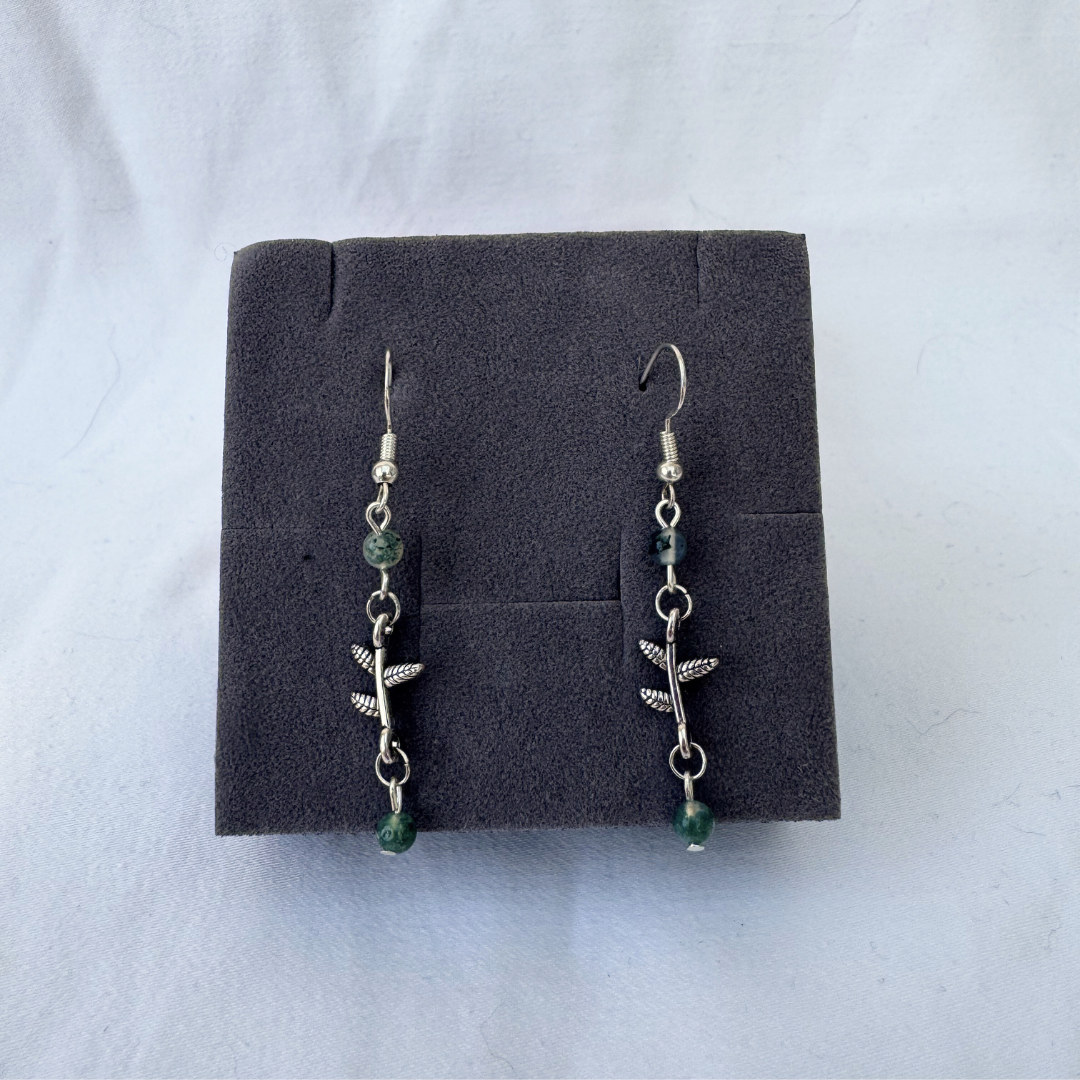 Crystal earrings handmade with moss agate. On sterling silver hooks.
