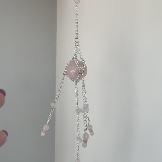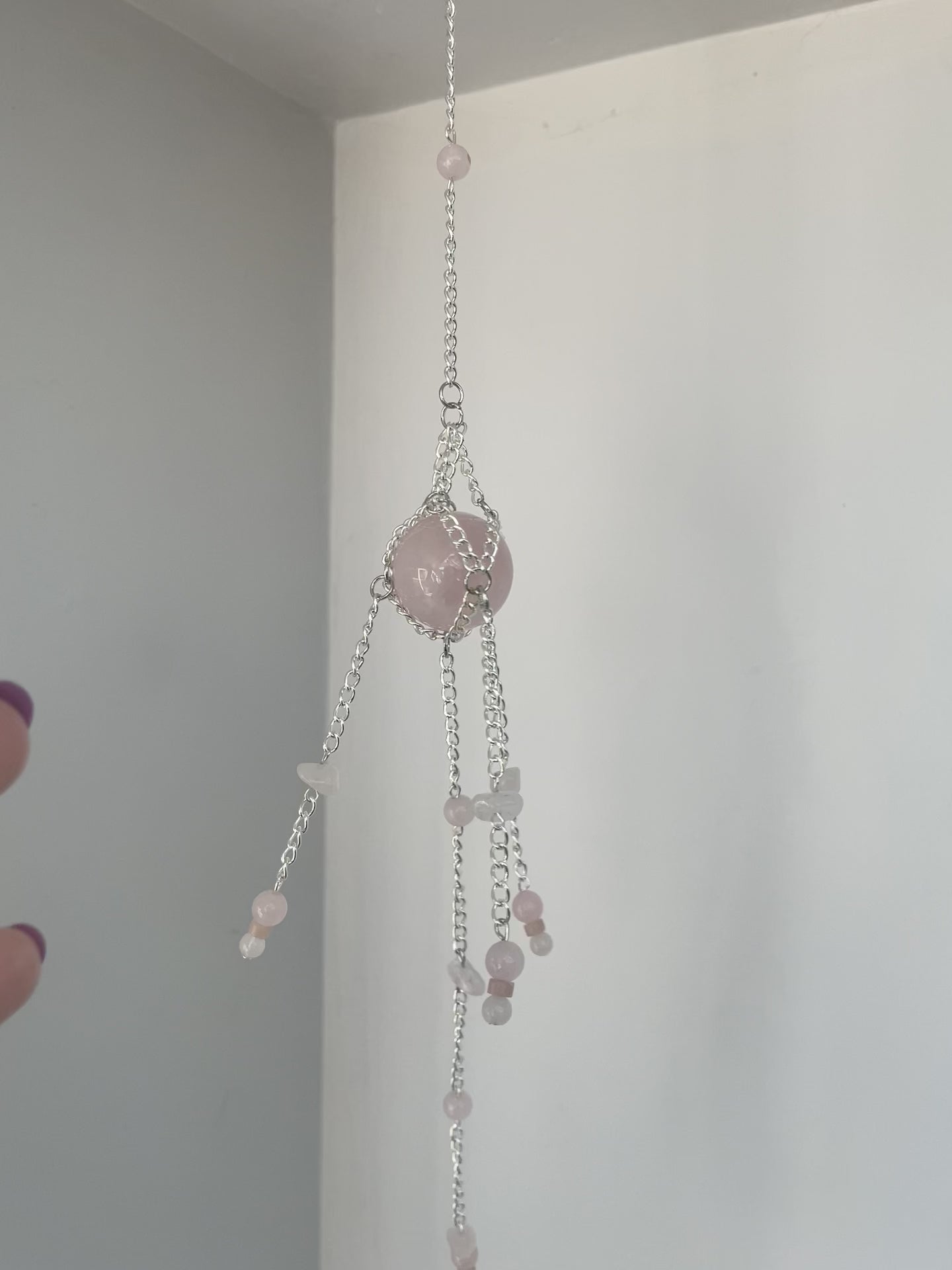 Handmade rose quartz sphere suncatcher/crystal wall hanging, made with rose quartz.