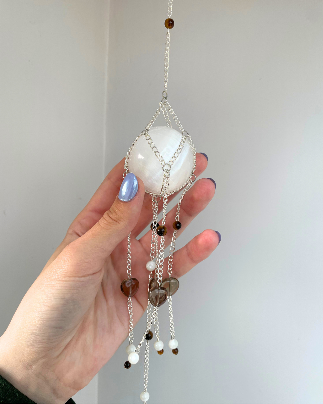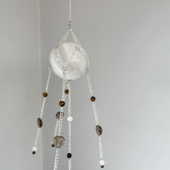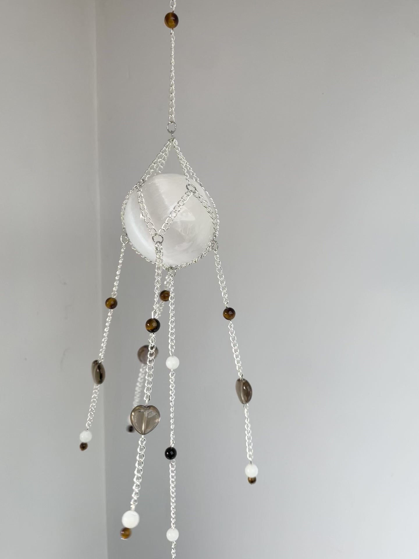 Handmade selenite sphere suncatcher/crystal wall hanging, made with smoky quartz, mother of pearl and tigers eye. With an agate disc on the end.