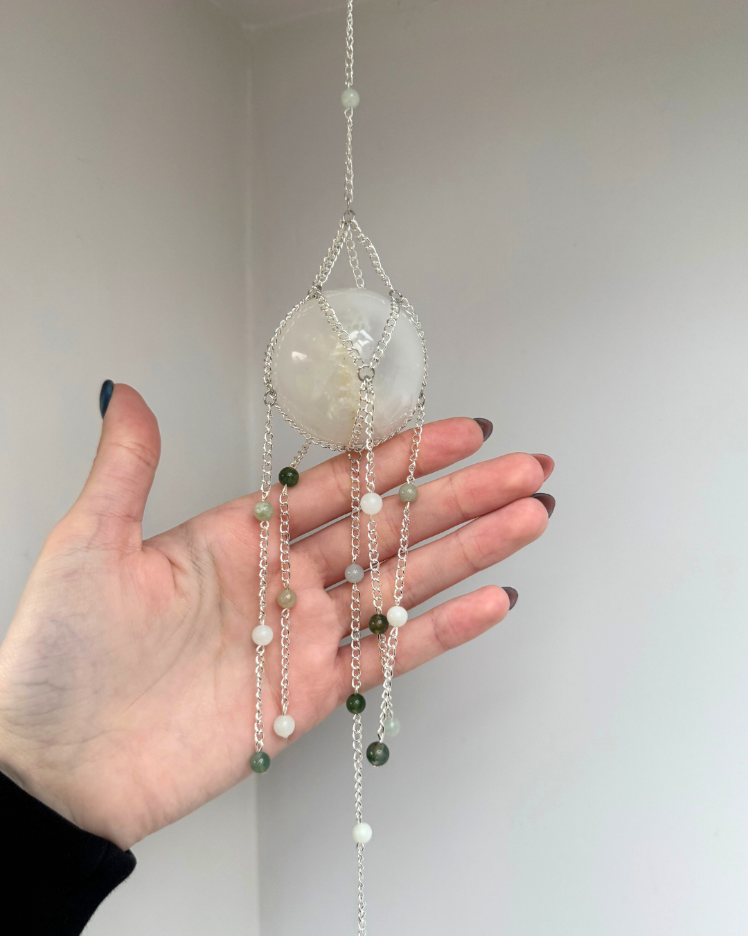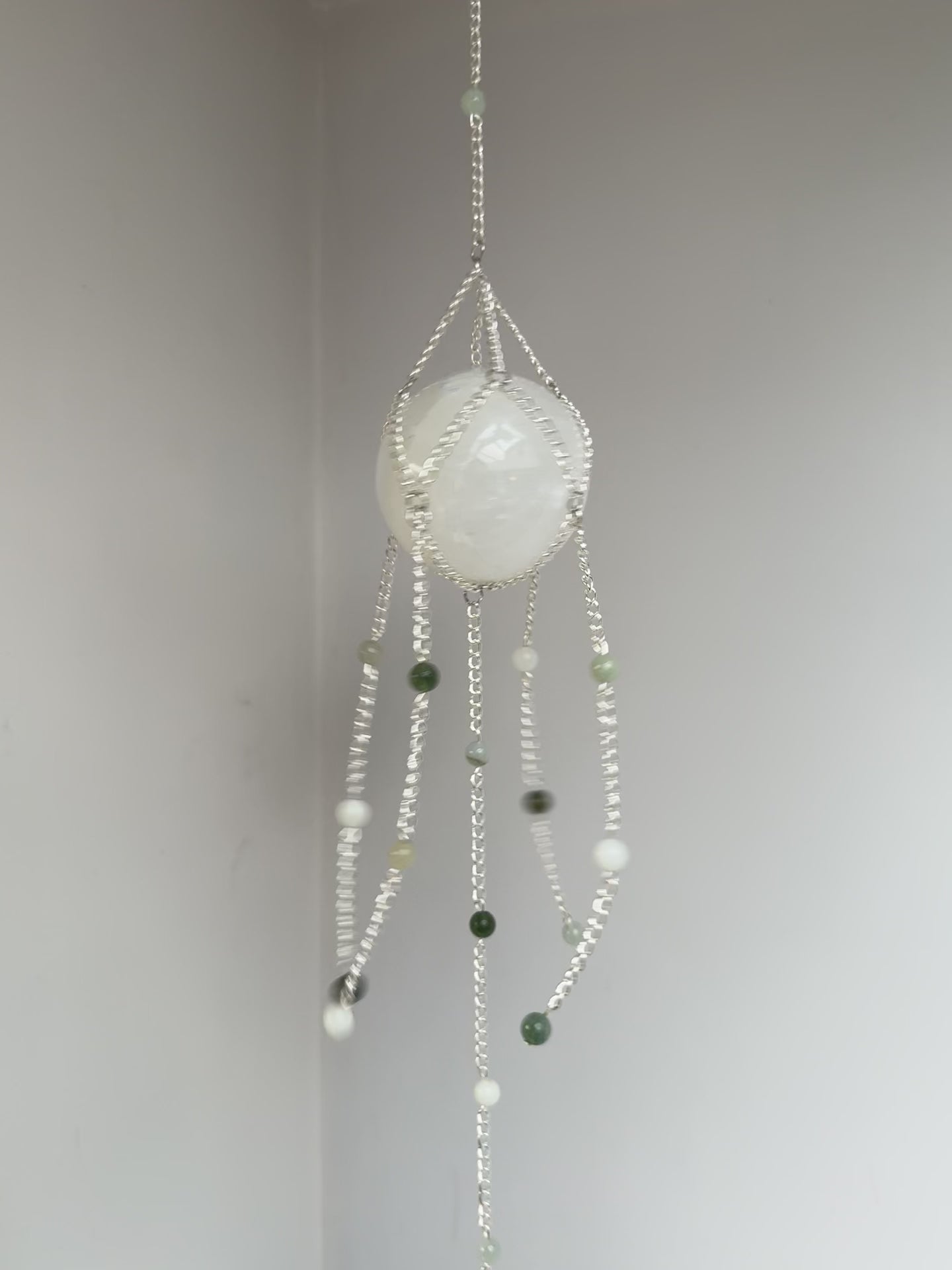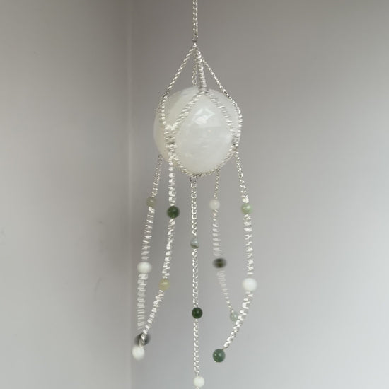 Handmade selenite sphere suncatcher/crystal wall hanging, made with chinese ammonite and, moss agate. With an AAA grade suncatcher crystal or a chinese amazonite chunk at the bottom.