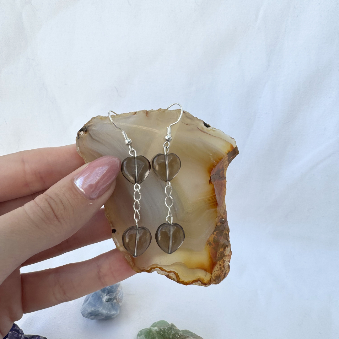 Crystal earrings handmade with smoky quartz hearts. On sterling silver hooks.