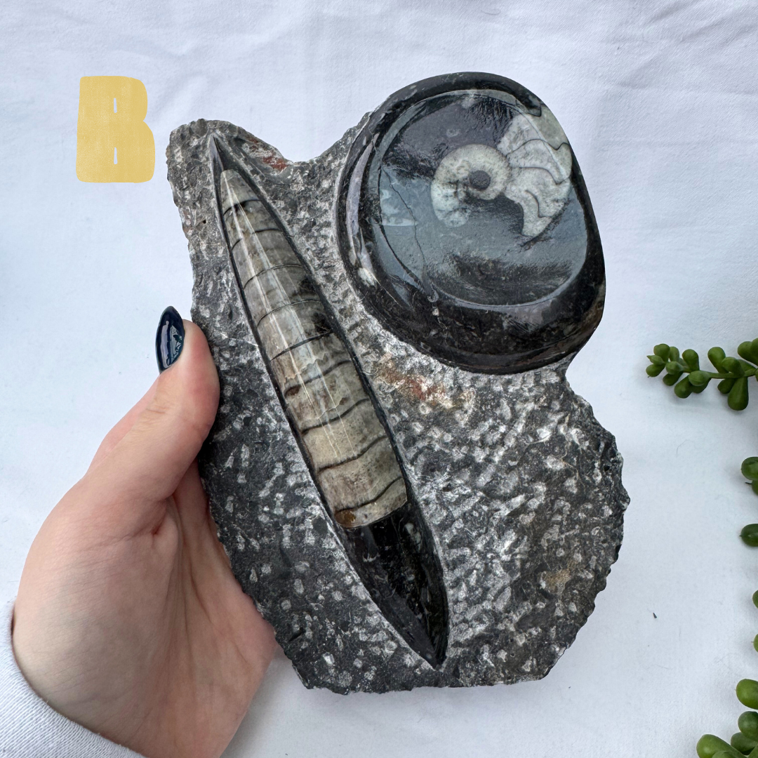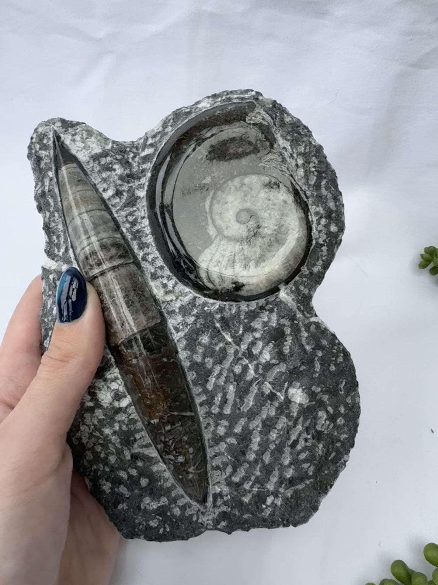Orthoceras + ammonite fossil standing statement pices. Carefully crafted to sit together.